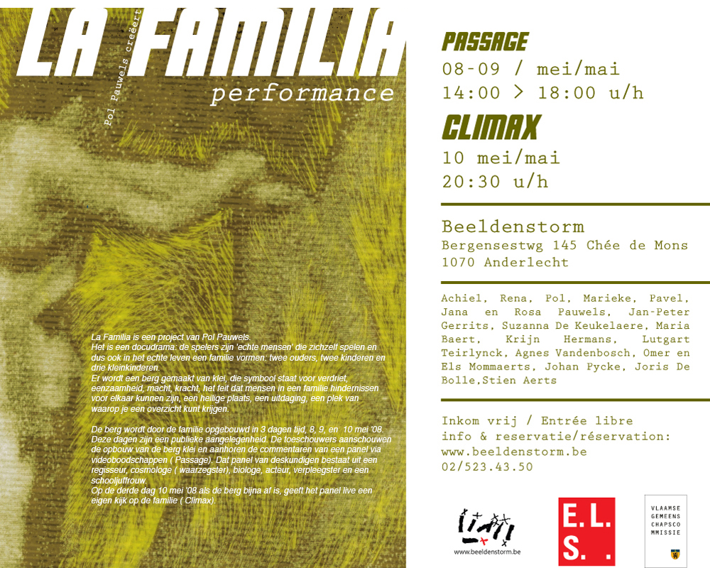 LA FAMILIA Een docudrama: de spelers zijn 'echte mensen' die zichzelf spelen en dus ook in het echte leven een familie vormen: twee ouders, twee kinderen en drie kleinkinderen. Er wordt een berg gemaakt van klei, die symbool staat voor verdriet, eenzaamheid, macht, kracht, het feit dat mensen in een familie hindernissen voor elkaar kunnen zijn, een heilige plaats, een uitdaging, een plek van waarop je een overzicht kunt krijgen. La Familia, Een docudrama: de spelers zijn 'echte mensen' die zichzelf spelen en dus ook in het echte leven een familie vormen: twee ouders, twee kinderen en drie kleinkinderen. Er wordt een berg gemaakt van klei, die symbool staat voor verdriet, eenzaamheid, macht, kracht, het feit dat mensen in een familie hindernissen voor elkaar kunnen zijn, een heilige plaats, een uitdaging, een plek van waarop je een overzicht kunt krijgen. De berg wordt door de familie opgebouwd in 3 dagen tijd, 8, 9, en 10 mei '08. Deze dagen zijn een publieke aangelegenheid. De toeschouwers aanschouwen de opbouw van de berg klei en aanhoren de commentaren van een panel via videoboodschappen ( Passage). Dat panel van deskundigen bestaat uit een regisseur, cosmologe ( waarzegster), biologe, acteur, verpleegster en een schooljuffrouw. Op de derde dag 10 mei '08 als de berg bijna af is, geeft het panel live een eigen kijk op de familie (Climax).